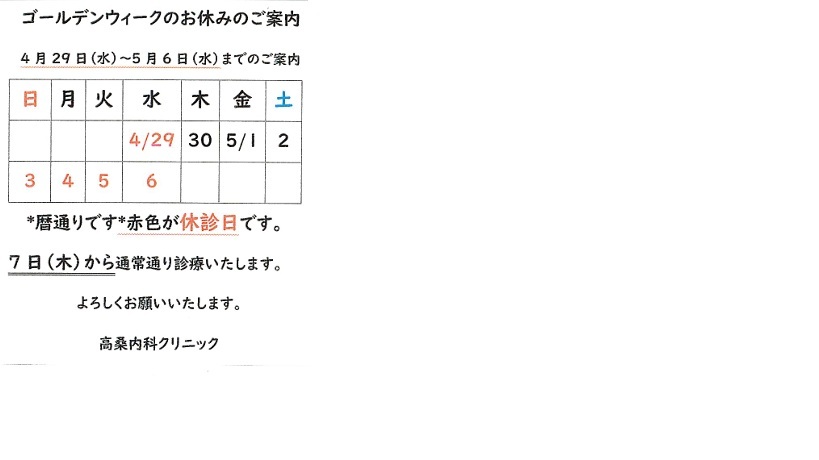 4/29~5/6の診療予定に関しては、暦通りの休診があります。